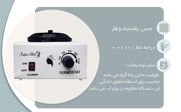 این دستگاه شامل یه قابلمه و المنت گرم کن است که قابلیت تنظیم دما و ثابت نگه داشتن دمای مواد را برای انجام بهتر اصلاح صورت یا بدن دارد
