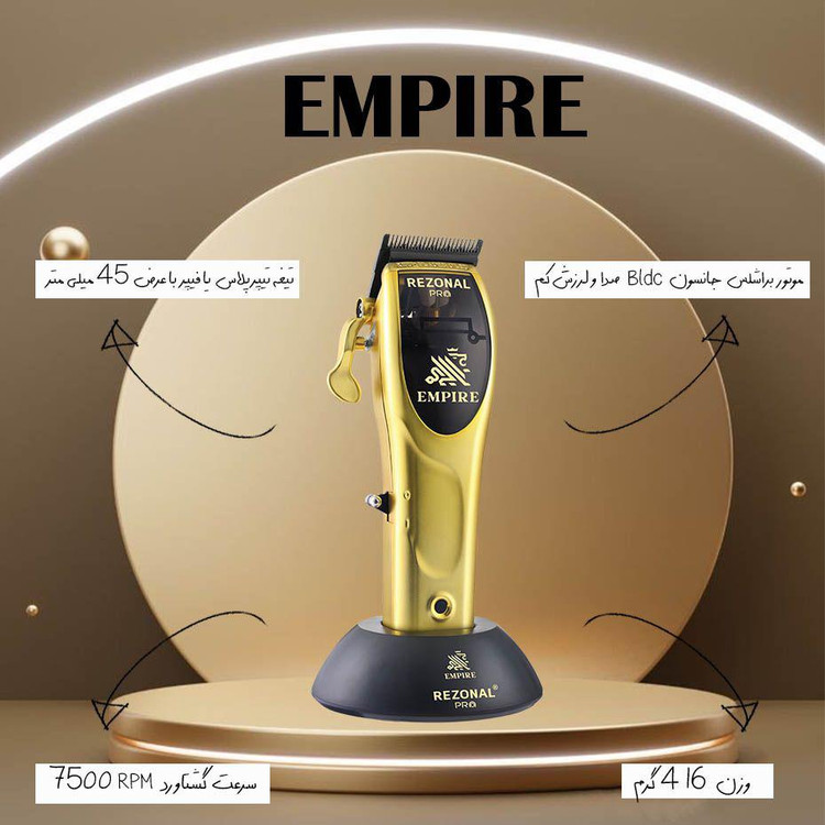 کلیپر امپایر رزونال یه حجم زن قوی با موتور براشلس جانسون Bldc فوق العاده بیصدا و کم لرزش است. تیغه این ماشین تیپرپلاس با فیپر با عرض 45 میلیمتر می باشد و سرعت گشتاور موتور 7500rpm